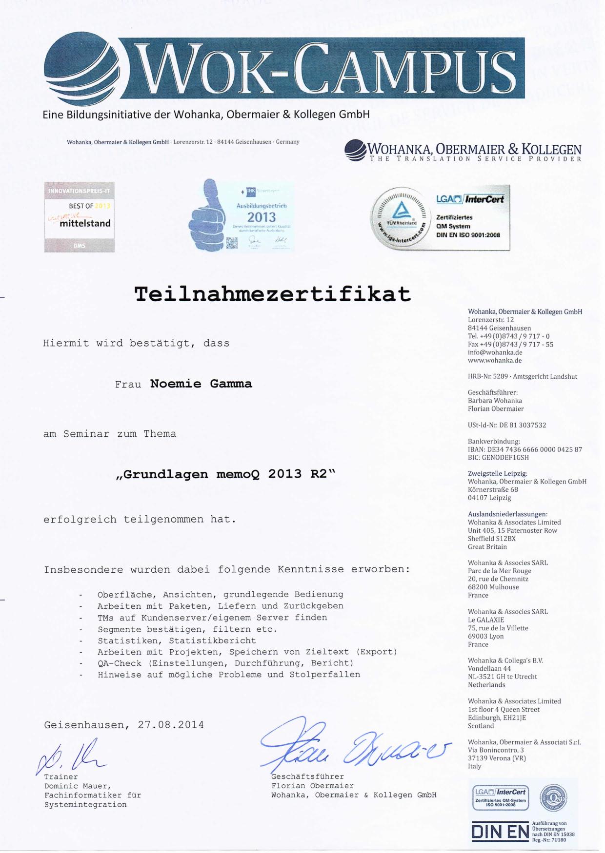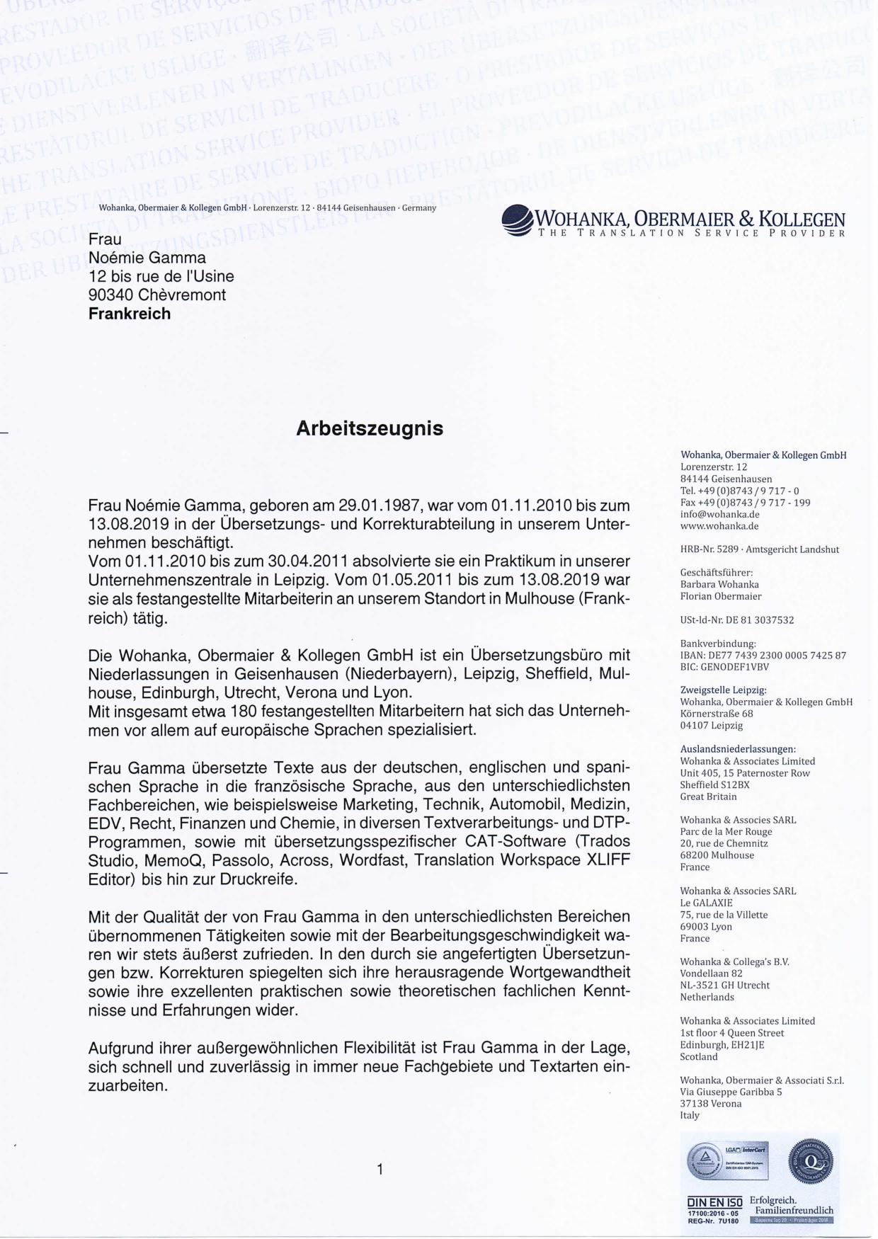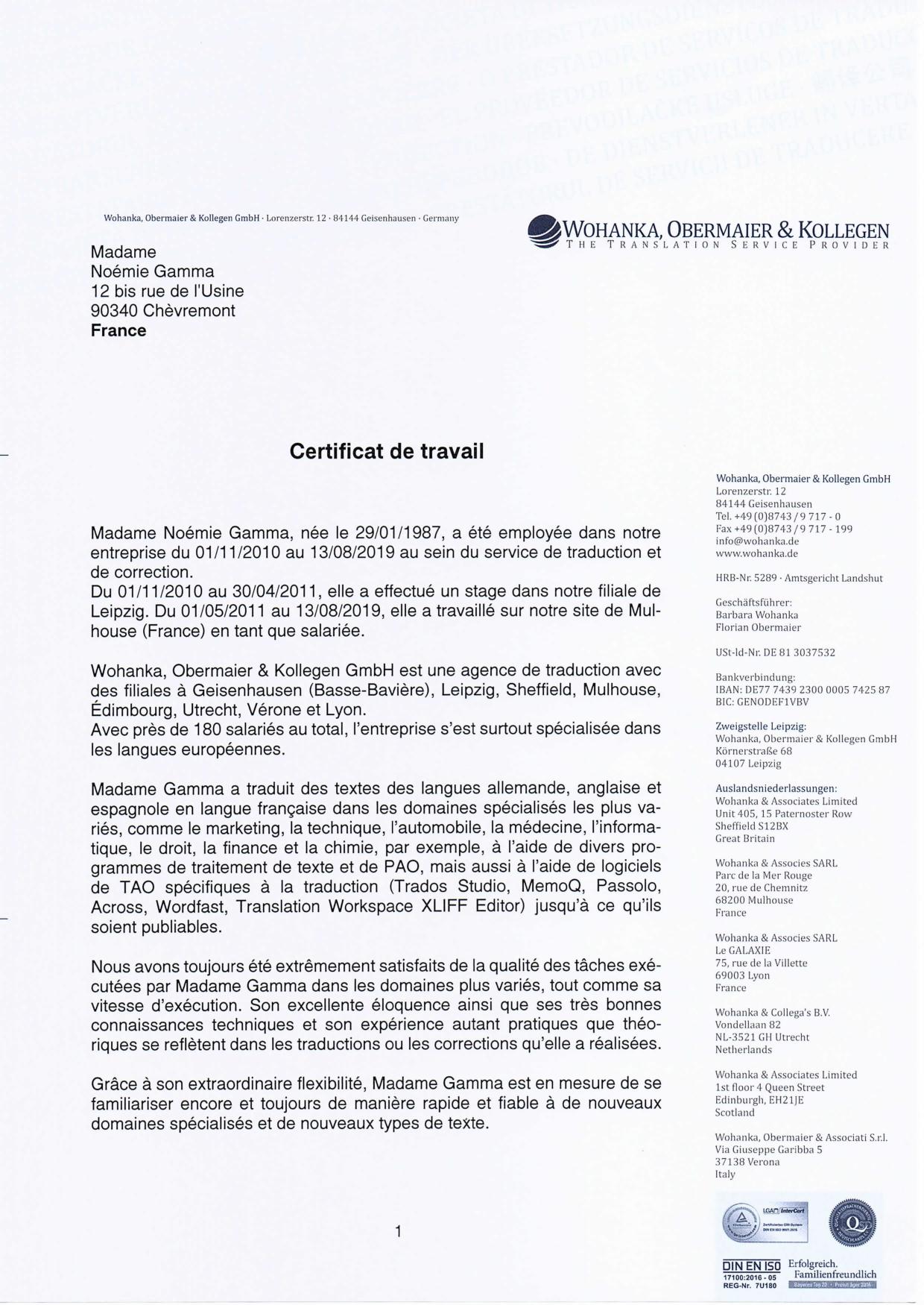 Après mon stage de master au sein de l’agence de traduction Adapt Localization Services GmbH, basée à Bonn (Allemagne), j’ai intégré une des filiales de la société bavaroise Wohanka, Obermaier und Kollegen GmbH à Leipzig (Allemagne), en tant que traductrice-relectrice stagiaire dans un premier temps, ce qui a ensuite débouché sur un CDI au sein de la filiale française : Wohanka et Associés SARL à Mulhouse. J’y ai cumulé bon nombre d’expériences et acquis de nombreuses compétences pendant presque 9 ans, avant de me lancer en tant qu’indépendante.